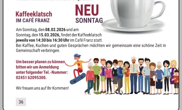 Sie sind hier: Veranstaltungen » Geselligkeit » Cafe Franz: Kaffeeklatsch