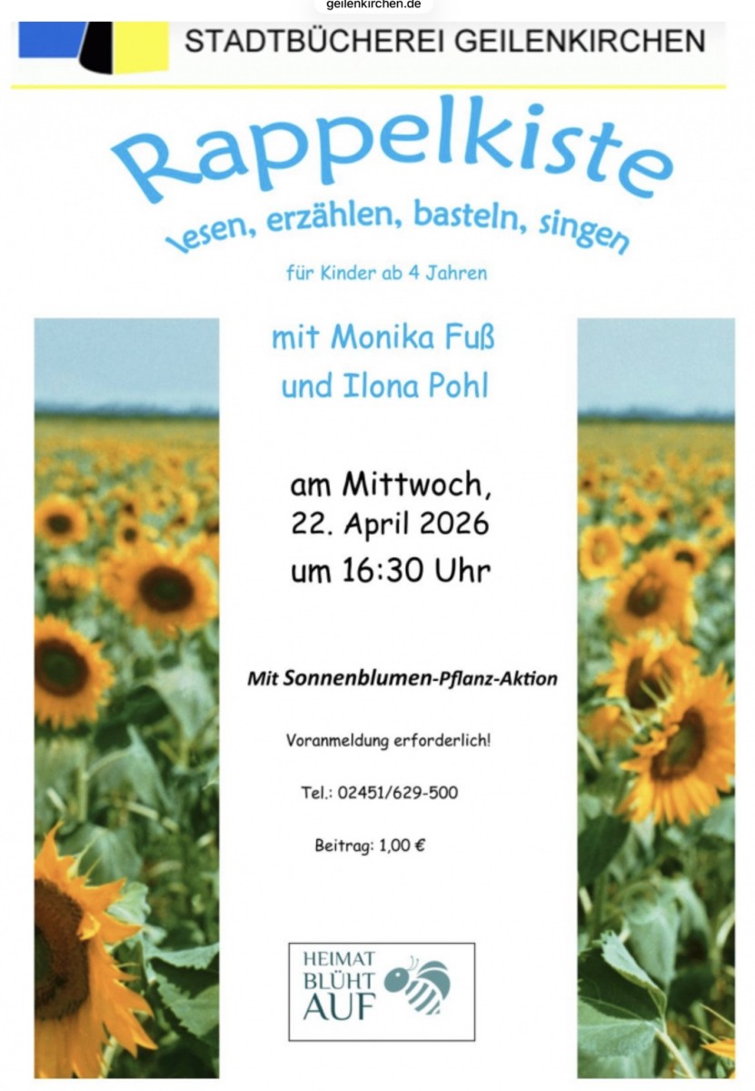Sie sind hier: Veranstaltungen » Gemeinschaftliche Aktivitäten » Stadtbücherei Geilenkirchen: Rappelkiste (mit Voranmeldung)