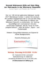- Dienstag, 24. Feb. 2026: Vortrag von Georg Mölich über Konrad Adenauers Köln auf dem Weg zur Metropole in der Weimarer Republik, Kastanienhof (Köln)