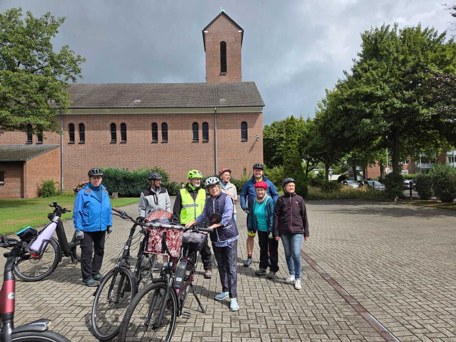 Am 02.08.2025 fand die diesjährige Radtour für Jung und Alt der KAB- Friedrichsfeld statt. Die Fahrt führte vom Maximilian Kolbe Haus aus über ca. 60 km zum Schloss Raesfeld. 9 Radfahrer nahmen an dieser Tour teil und mussten sich unterwegs dreimal wegen Regen unterstellen, um nicht durchnässt zu werden. Am Schloss Raesfeld kehrte man dann im Restaurant Freiheiter Hof ein, wo man sich bei Kaffee und frisch gebackenen Waffeln für den Rückweg stärkte.