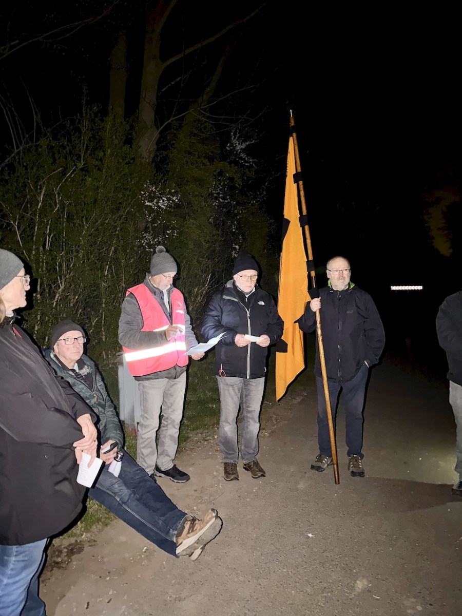 Am 21. März 2026 trafen sich zehn Teilnehmerinnen und Teilnehmer (fünf Frauen und fünf Männer) um 19:15 Uhr an der Elisabethkirche in Friedrichsfeld zum diesjährigen Friedensgang nach Eppinghoven. Zu Beginn gab es eine kurze Einführung mit einem Text gegen Rassismus und Rechtsradikalismus. Dieser wurde von unserem Diakon und Präses Martin Berendes vorbereitet und regte zum Nachdenken über Frieden, Zusammenhalt und gegenseitigen Respekt an.