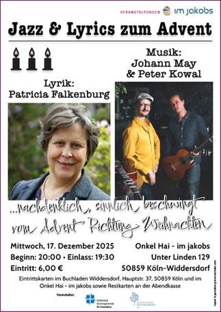 Onkel Hai – VERANSTALTUNGEN im jakobs und die Pfarrgemeinde St. Franziskus laden Sie zum 5. Mal in Folge zu „Jazz & Lyrics zum Advent“ ein. Erleben Sie auf dem Weg vom Advent zu Weihnachten einen zuweilen nachdenklichen, sinnlich beschwingten Abend, an dem Jazz und Lyrik sich ergänzen.